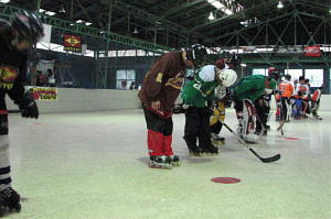| 今期からルール改正が決まり、初日はリーグ2と同じくルール説明会が開かれてからの大会となりました。 熱心に聞き入る選手の皆さんは今後横浜のインラインホッケーを引っ張っていく存在になるであろうと思われます。 他地域での大会でも横浜地区のルール理解度の高さ、スポーツマンシップとフェアプレーの精神で横浜地区の質の高さを見せてもらいたいと記者は期待しています。 さてリーグ3開幕戦は新しいチーム同士の戦い! くろべぇ(プロ仕様)対ちーむイヒ!の一戦! ちーむイヒ!は熱心な平日練習を経て満を持しての出場! くろべぇ(プロ仕様)はBBQの材料がプロ仕様だという噂だがメンバーは戸塚常連連合チームとなっているようだ。 第1ピリオド、幸先良く先制したのはちーむイヒ! 1:54に5番松下選手がパワープレーから先制点をもぎ取ると4:35にも3番小宮山選手の追加点で波に乗る! 第2ピリオドにも10番天野選手の追加点で3−0と突き放すが何とか点数の欲しいくろべぇ(プロ仕様)も30番鈴木選手→64番末永選手の連携で反撃のゴールを決める! すると動きの良くなってきたくろべぇ(プロ仕様)を押さえようと懸命なプレーが裏目となり、ちーむイヒ!はペナルティが重なってしまう! すると第3ピリオドから33番芳賀選手のゴールを皮切りに75番加賀見選手、1番稲垣選手らのゴールで3−3の同点! 緊迫の第4ピリオドにくろべぇ(プロ仕様)の1番稲垣選手が決勝ゴールを決めて5−4とくろべぇ(プロ仕様)辛くも勝利を納めた! しかし第3クオーターの反則が重ならなければ互角だっただけに両チームの実力はまだまだこれから本調子を迎えるかもしれない。 |