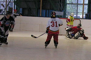 | 初戦の固さからか得点が前回得点につなげることの出来なかったバクテリア。熱戦のシュートアウト後に惜しい試合を引き分けとしてしまったDRAGS。 両チームの意気込みとは裏腹になんとリンクコンディションが悪く、湿度のせいか、時間がずれこんでしまった第1試合。 両チームの集中力にこの1時間遅れがどれほど影響するだろうか・・ いくらかの改善はみられたものの、まだリンクの状態は決して良くないまま両チームの合意で開始された第1試合は、前回から得点を欲していたバクテリアの猛攻から始まった! 試合開始0:53、バクテリア77番金田選手のゴールでベンチが歓声に包まれる!さらに応援に応えるかのように3:11、11番内田選手のゴールで喜びに沸くベンチ! しかし6:00、DRAGSは2番鶴谷選手→8番日高選手のゴールで落ち着きを取り戻すと第2クオーターには8番日高選手→88番武藤選手の連携で連続ゴールを上げ逆転!第2クオーターを終了して3−2とDRAGSが試合自チームのペースに持ち込む。 しかし流れが変わったのは第3クオーター。 バクテリアがパワープレーで得点すると9:56、51番原選手→77番金田選手のゴールでついに同点に追いつき両者は一歩も譲らない戦いとなった! 第4クオーターも両チーム2得点をあげ同点で迎えたシュートアウト。 バクテリアはこの日4ゴールをあげた77番金田選手を先頭にゴールをあげ、11番内田選手もゴールを上げると、DRAGSはこの日2ゴール2アシストの8番日高選手が止められ5人目に4得点を上げていた武藤選手に順番が回ることなくシュートアウト0−2でバクテリアに惜敗することとなった!バクテリアには嬉しい勝ち点がつき、惜しくも敗れたDRAGSであったが自分達のペースで序盤の劣勢を引き戻せる力があるだけに今後の巻き返しに期待したい! |