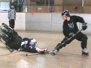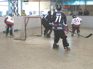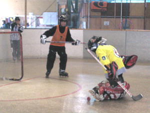 第2試合は1位通過のひよっこもずくす対4位通過のCLOVERの対戦! 先制点はCLOVER11番末永選手! 8:54にゴールを決め快調な出だしを見せる。 第2ピリオド、パワープレーからひよっこもずくすが2番稲村(彰)選手→6番奥田選手の連携でゴールを決めて同点! さらに3:52にも2番稲村(彰)選手が決めて2−1と逆転! 1位の底力を見せる。 しかしこの日のクローバーは動きが衰えず、11番末永選手が再び同点弾を放つと3番本間選手→30番鈴木選手のゴールで再び逆転! この後第3ピリオドは両者打ち合いになるも両GKのファインセーブで得点はならず勝負は第4ピリオドへ! 3−4で向かえた第4ピリオドひよっこもずくすは0:31、またしても2番稲村(彰)選手が同点弾を放ち試合は振出へ! しかし死力を尽くした試合は2:19にCLOVER30番鈴木選手のゴールが決勝点となりゲームセット! 4位から接戦を制してCLOVERが決勝へ進出を決めた! |