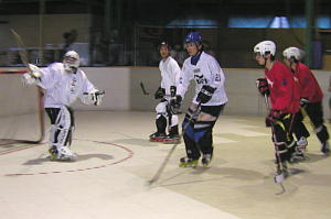 | リーグ2今期最後の試合はOVER対コヅモの一戦となり、両チーム共に大量得点での決勝進出となった。 リンク状態の悪い中いつも通りの試合展開は期待できず果たしてこの決勝にどのような影響を及ぼすのか?? 序盤から好調な出だしを見せたのはコヅモ! 1:51コヅモ22番セグラマウリシオ選手のゴールで先制すると、73番中澤選手→71番河原選手のゴールで追加点、さらに96番セグラウラジミル選手らのゴールで第1クオーターを4ー0で通過するコヅモ! 第2クオーターにも着実に得点を重ね、反撃したいOVERであったが第2クオーター8:55に86番落合選手→32番徳野選手のゴールが飛び出すも前半を終了して7−1と不本意な内容。 同じコートで試合しているにも関わらず、やはりコートに苦戦するOVERに対して、バランスこそ崩す場面はあるものの非常に動きの良いコヅモ。 第3、第4クオーターに20番中島選手が追加点を加えたOVERに対してセグラ兄弟の連携が炸裂したコヅモは9点を追加して16−3とOVERに圧勝! 予想だにしない展開に観客を驚かすも、セグラマウリシオ選手はなんと7ゴール5アシストと12ポイント、セグラウラジミル選手が6ゴール2アシストで8ポイントと大活躍し、念願の優勝を手にすることとなった! 滑るコートでも思い切りの良い走り込みとパスワークのコヅモに対して今まで急激な展開にも対応してきたOVERのDF陣もこの日ばかりはスケーティングがついて来ず、最後の最後で優勝を逃してしまう結果となった! |