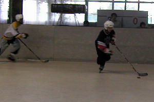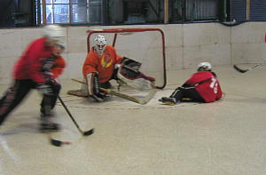 第4試合、みずたまりベーハー vs ムーンシューターズの試合はムーンシューターズ77番森谷選手が開始51秒に幕開けゴールを決めるものの、みずたまりベーハー7番山上選手、4番大森選手、0番森下選手などの厚い攻撃陣の活躍で序盤からムーンシューターズを圧倒! 前半を終了して7−1と大爆発となった! 第3クオーターも攻め続けるみずたまりベーハーにペースを掴ませてもらえないムーンシューターズであったが、第4クオーターにキャプテン22番津崎選手が2ゴールをあげる。 しかし終始攻撃の手をゆるめなかったみずたまりベーハーはシュート本数を42本対30本と圧倒し、9対3と快勝し、その個人能力とチームワークを見せつける形となった! 今期このリーグ優勝候補筆頭のみずたまりベーハーがその力をいかんなく発揮し、今後はみずたまりベーハー攻略が決勝リーグへの目標となりそうだ。 また負けはしたもののムーンシューターズは個人能力の高い選手も多く、コートとリンクへ慣れてくるとその力を今後は発揮することになると予想される!両チームの今後に注目である! |