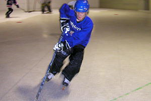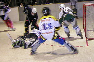 YSHL2の一戦。 試合は序盤から積極的にシュートを試みるTeam YSHL2が68番内藤選手のゴールで先制! しかし再三のチャンスを"W"RED-ZONE88番笹尾(修)ゴーリーに阻まれファインセーブを連発!! あまりの素晴らしいセーブに敵Team YSHL2ベンチからも賞賛の声があがったほど! Team YSHL2エースの77番須永選手も1点に抑えられ第2クオーターを終えて2−0と攻めながらも得点が取れない嫌な展開に持ち込まれる。 後半センターリング型の攻撃へ転換したTeam YSHL2の攻めがついに"W"RED-ZONEの固い門を開け第4クオーターに4得点と安全圏へ逃げ切り、最後に"W"RED-ZONE93番下村選手の完璧なコースのシュートを決められたものの、この試合28本のシュートを1失点で抑えたTeam YSHL278番町田ゴーリーが激しいゴーリー争いを征し見事ベストGKのポジションに着くこととなった! |
