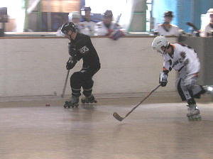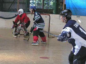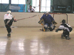 前回はGKのいないベーハーに大勝したものの、この試合ではどれだけの実力をもつのか未知数のCRUSHERS。 対戦相手は常に接戦でここまで1勝1敗のTHURSDAY。 この試合もロースコアの接戦かと思われたが意外な出だしとなった! まずはCRUSHERS19番キャプテンの山口選手が先制点をあげると、これに続けとばかりに77番長澤選手、88番山本選手、48番土方選手とゴールラッシュ! なんとTHURSDAY相手に1ピリオドで一挙に6−0と大量得点を叩き出す! この点差はこのクラスでは決定的かと思われた第2ピリオドからTHURSDAYも反撃を開始! 33番佐々選手のゴールを皮切りに14番荒川選手のゴールで連続得点するも要所要所でCRUSHERSも追加得点をあげ追いつかせない点の取り合いとなった! 試合は合計7点をあげたTHURSDAYであったが順調に追加点を加えたCRUSHERSが11−7で快勝! すさまじい攻撃力を見せて1位をキープしている! |