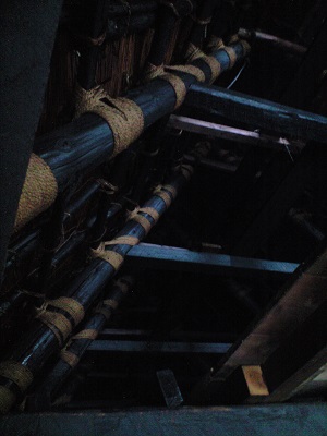 | 2階3階は明かりを確保するために窓がありますが大きい建物なので暗いです。 茅葺屋根はどうしても雨で傷みやすく、虫がつきやすい屋根です。 常に火を焚いて煙で燻すことで乾燥し、虫を付きにくくすることができます。 また屋根組の一部が縄で組んである単純構造ですがこれが煙で燻されることに強靭な鎖のようになっていきます。 現代建築の金物のように取り付けた当初が最大力で経年劣化していくのと違い、こちらは時間の経過とともに長期間強靭さを保つことができます。 あったまいい! |